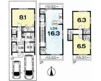 | 特色 | 1階31.74平米 2階33.61平米 3階26.66平米、駐車2台可(1BOX+軽自動車)、私道負担9.68平米有 | ||