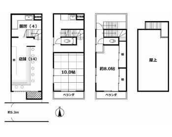 | 特色 | 連棟、2K+店舗、1階29.25平米 2階29.25平米 3階29.25平米、2024年8月全面改装済、大映通商店街面す、南向き | ||