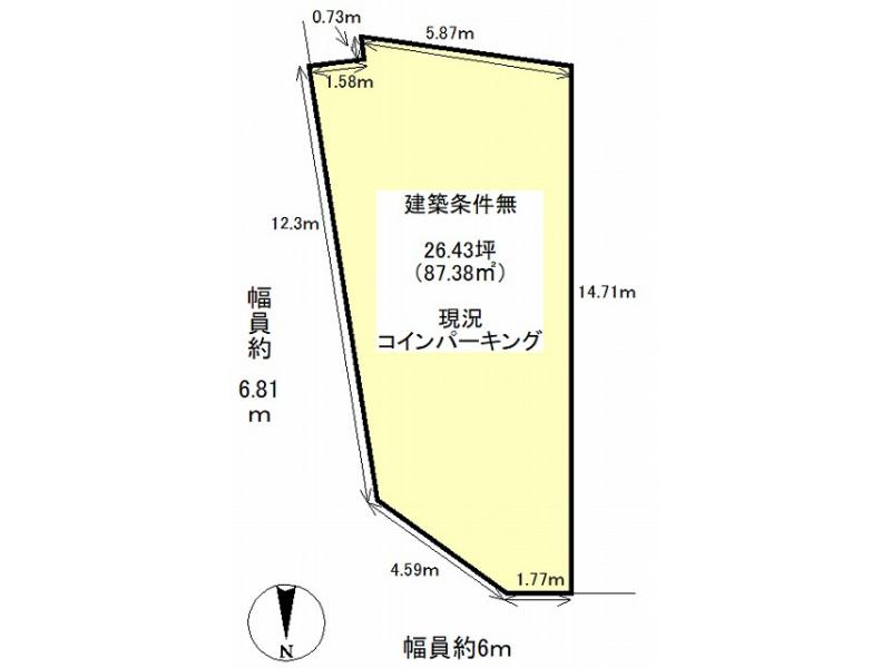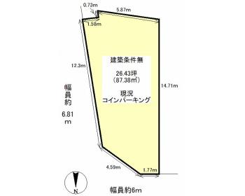 | 特色 | 建築条件無、北東角地、現況コインパーキング | ||