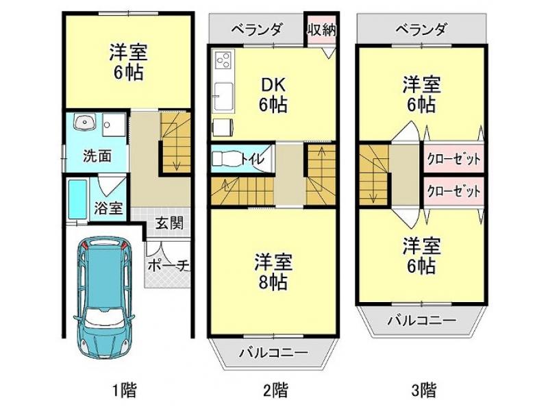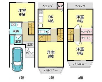 | 特色 | 1階32.40平米 2階29.97平米 3階25.92平米、駐車1台可、2025年2月改装済:バス・トイレ・洗面新調/全居室クロス貼替/全居室換気扇新調/2階エアコン・2階ベランダ物干新調/各部屋ホスクリーン3箇所新調など | ||