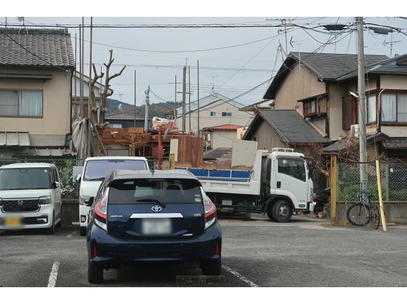 北東角地の物件ですが、面している道は約2.7m~約3.4mと少し狭い道です。物件前は広いガレージで圧迫感がなく、見晴らしがいいです。お買物はFOOD SHOPエムジー徒歩5分、フレスコSAGA店徒歩9分。学校は嵯峨野小学校徒歩9分。