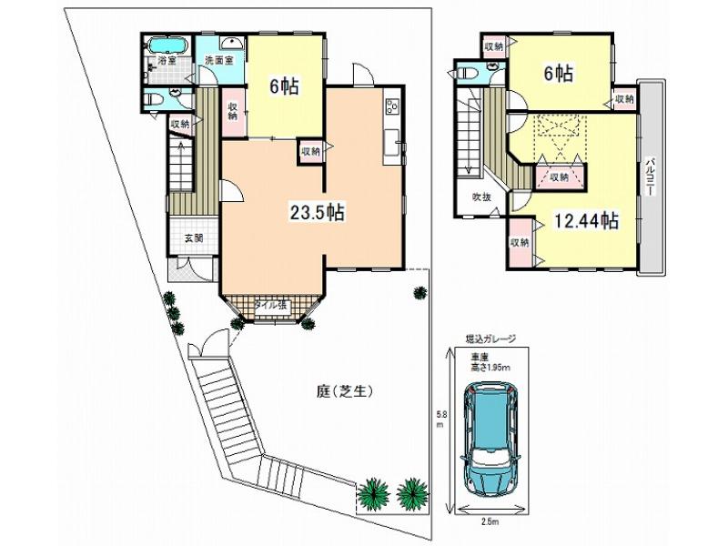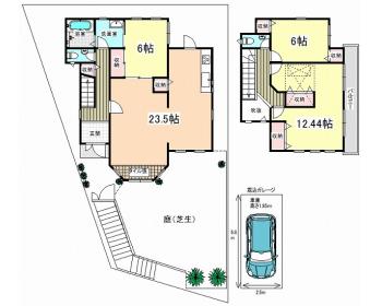| 特色 | 1階68.73平米 2階43.88平米、附属建物:車庫・鉄筋コンクリート造平屋建18.27平米、駐車1台可:堀込ガレージ高さ1.95m・幅2.5m・奥行き5.8m/電動シャッター、天井収納庫約3帖有、南東角地・南向き、近鉄京都線久津川駅徒歩約19分、京都京阪バス大谷停徒歩約4分 | ||