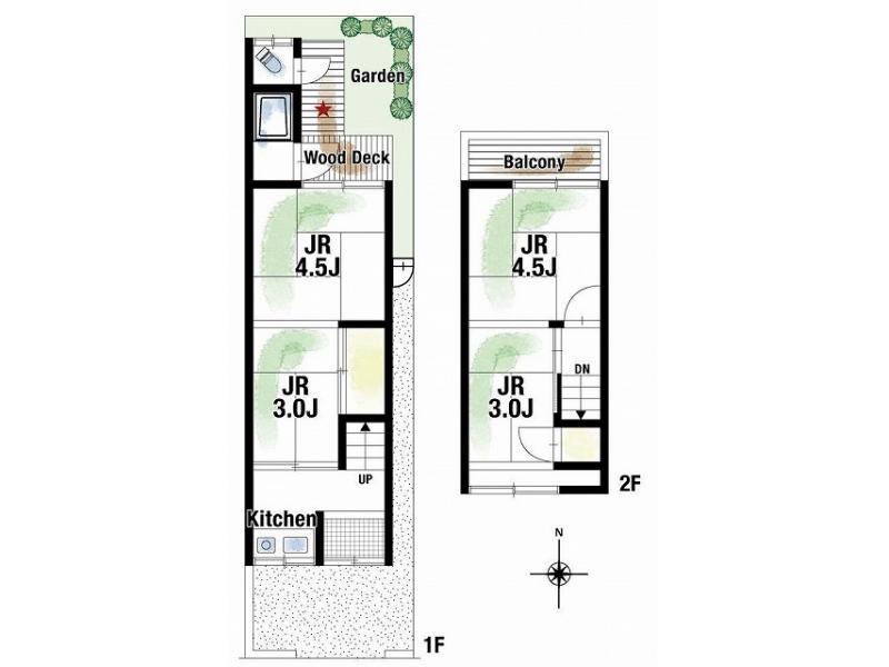 | 特色 | 連棟、1階21.75平米 2階14.41平米、2025年11月改装済:新調・・中庭デッキ・トイレ・クロス・畳・襖・床(一部)、有効土地面積約44.7平米・セットバック面積0.45平米・公簿45.15平米、売主の契約不適合責任免責・設備修復義務責任免責 | ||